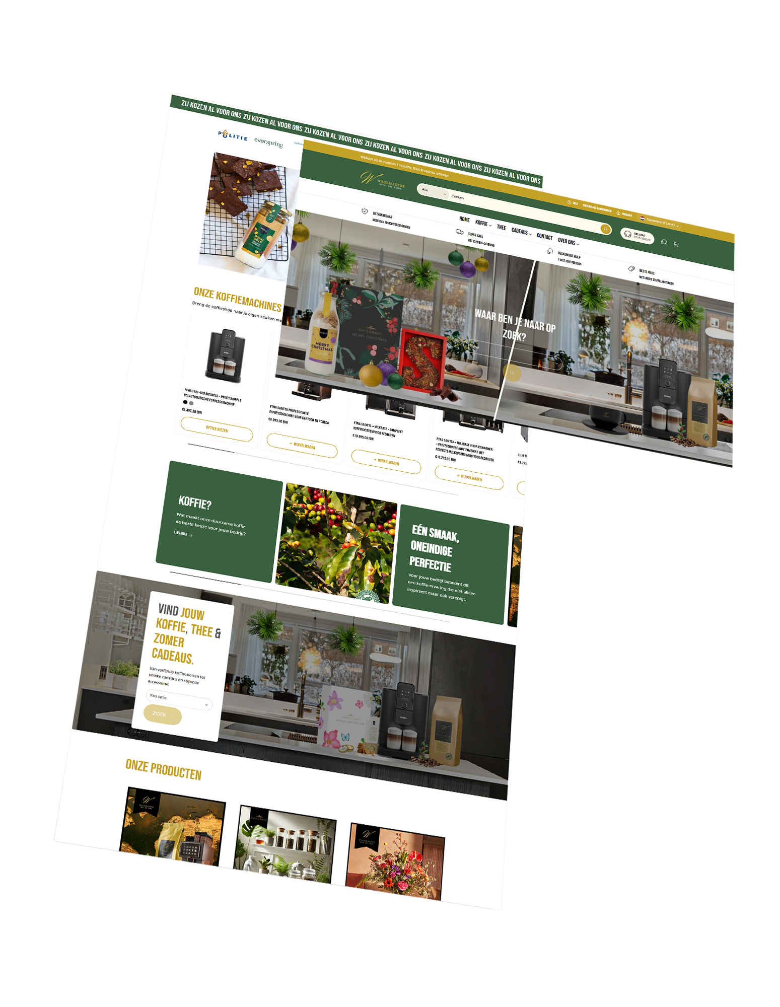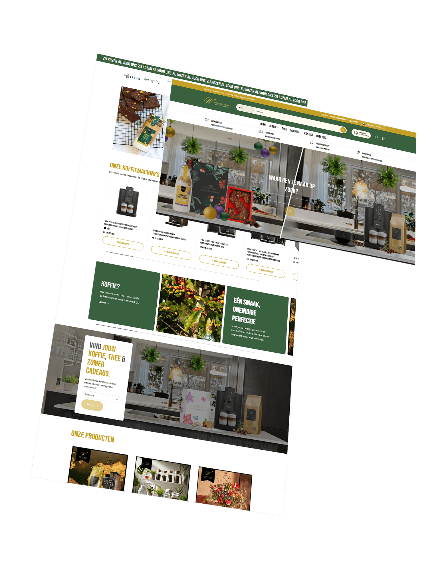 Volledig nieuwe Shopify webshop ingericht met een modern thema, afgestemd op de huisstijl van Wagemakers Koffie. Het resultaat is een frisse en professionele uitstraling die perfect bij het merk past en vertrouwen wekt bij bezoekers.